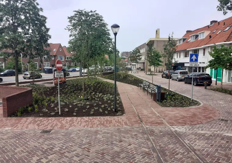 Met de vele winkels, woningen en de drukke weg hier omheen, was dit een grote uitdaging. De spoorbaan die ooit verwees naar de oude fabriek, liep door het park en de rijbaan heen. Deze spoorbaan is verplaatst en daarbij is de bestrating van de rijbanen, parkeervakken en trottoirs verwijderd en opnieuw ingericht en aangelegd.
