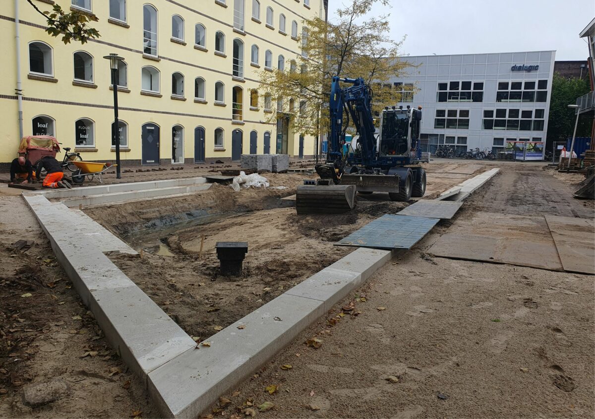 In een paar maanden tijd is een plein met alleen bestrating heringericht in een plein met groen.